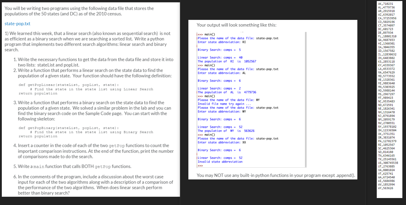Loop through the entire dictionary showing the state abbreviation, state name, and state capital (see sample output).